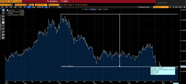 Com efeito, o yuan tem vindo a depreciar face ao euro, em mais de 17% desde os máximos de 2022.