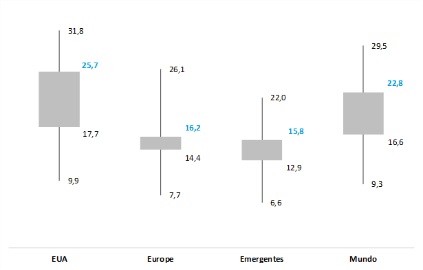 Figura 5: Múltiplos Price-to-Earnings: Estados Unidos, Europa, Emergentes e Mundo