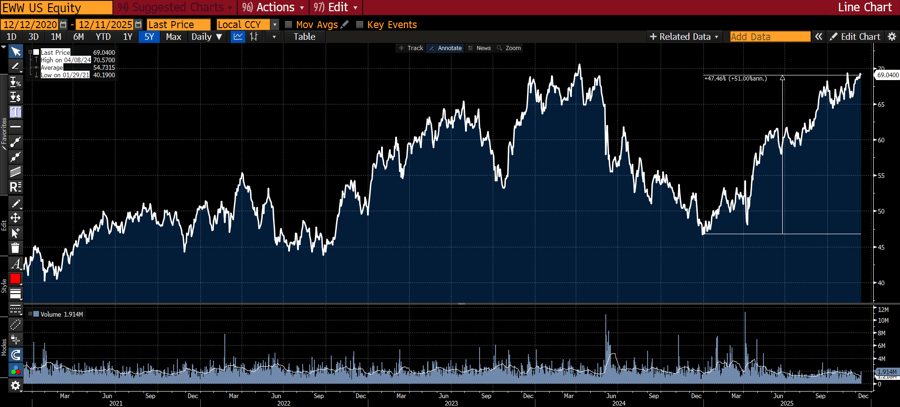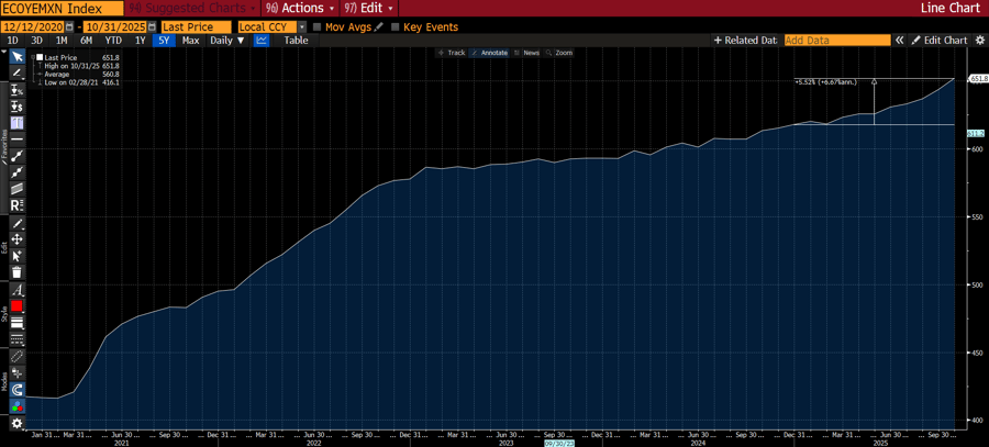 Com uma expetativa de crescimento moderada para o próximo ano, tendo em conta a instabilidade política e institucional e a sua elevada dependência das exportações para os Estados Unidos (e consequentemente das políticas de comércio impostas por Donald Trump), a continuação deste trend para 2026 não é clara. Não obstante, considerando que o índice ainda não atingiu novos máximos desde o início de 2024, o mesmo poderá continuar a beneficiar do nearshoring e das isenções atribuídas pelo USMCA, dependendo do impacto das tarifas impostas não só pelos Estados Unidos ao México, mas também impostas pelo México a diversos países asiáticos.
