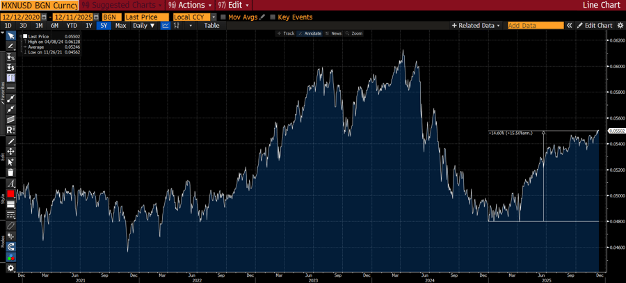 No caso do impacto cambial, este foi também bastante positivo para o peso mexicano em 2025, tendo apreciado mais de 14%, atendendo, especialmente, a um aumento significativo do investimento direto estrangeiro, sobretudo em sectores industriais e tecnológicos como consequência do nearshoring. Este investimento ultrapassou os 40 mil milhões de dólares em 2025, um dos maiores valores das últimas décadas (o que levou ao aumento da procura pelo peso mexicano).