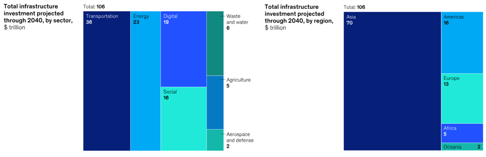 A consultora McKinsey & Co. estima que serão necessários investimentos acumulados de US$ 106 biliões até 2040 (ver Figura 3): Transporte e Logística (USD 35 biliões), Energia e Electricidade (USD 23 biliões), Digital (USD 19 biliões), Social (USD 16 biliões), Infraestrutura de Resíduos e Água (USD 6 biliões), Agricultura (USD 5 biliões) e Defesa (USD 2 biliões). Do ponto de vista geográfico, até 2040, a Ásia terá a maior alocação, com 70%, seguida das Américas, com 18% e da Europa, com 13%, dos USD 106 biliões totais.