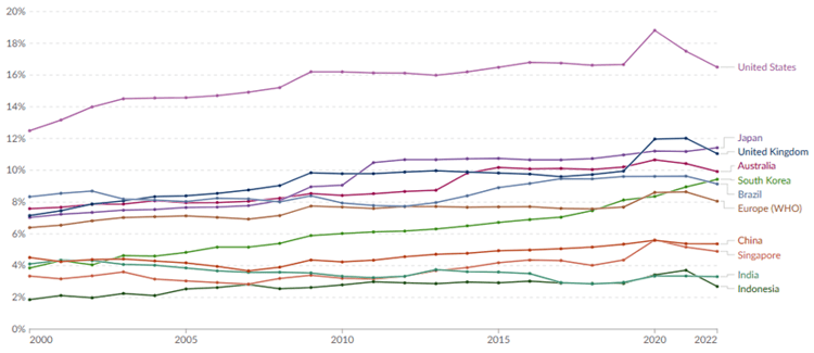 Figura 5 - Despesas totais com saúde como percentagem do PIB de 2000 a 2022