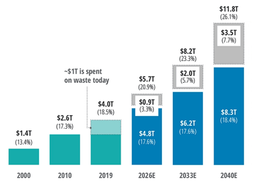 Em simultâneo, temos assistido a um aumento muito significativo das despesas com cuidados de saúde nas principais geografias, com um claro destaque para os Estados Unidos: de 12,5% do PIB em 2000, para 16,5% em 2022, um aumento de 32% num intervalo de 22 anos (ver Figura 5). A The National Health Expenditure Accounts (NHEA) estima que esse aumento não deverá ficar por aqui e que os gastos com saúde nos EUA, em percentagem do PIB, chegarão aos 26% até 2040, ou USD 12 biliões (ver Figura 6).