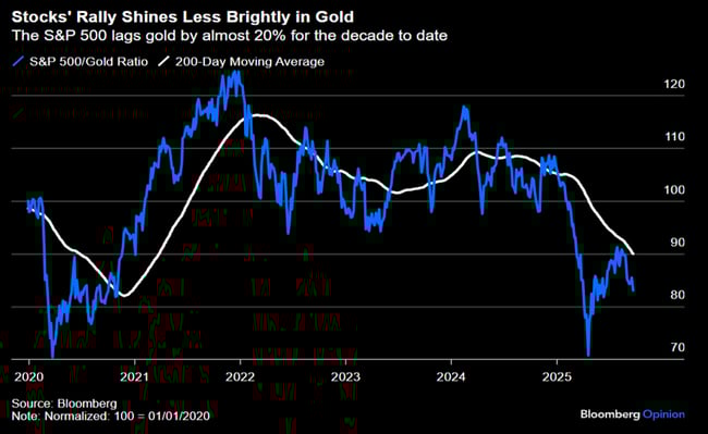 No entanto, na presente década, o Ouro tem registado um desempenho superior ao do S&P 500, facto evidenciado pelo rácio S&P 500/Ouro, actualmente próximo dos níveis mais baixos dos últimos anos: