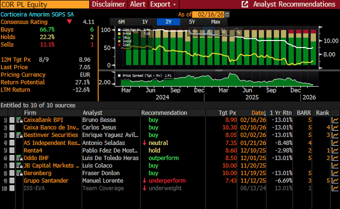 Dos nove analistas de bancos e casas de investimento que publicam regularmente estudos sobre as acções da Corticeira Amorim, seis recomendam a sua "compra", dois aconselha "manter" e apenas um apoia a "venda".