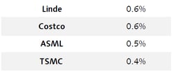 No que diz respeito aos principais contributos para o desempenho do Fundo no último trimestre, destacamos a evolução positiva das acções da Linde, Costco, ASML e TSMC.